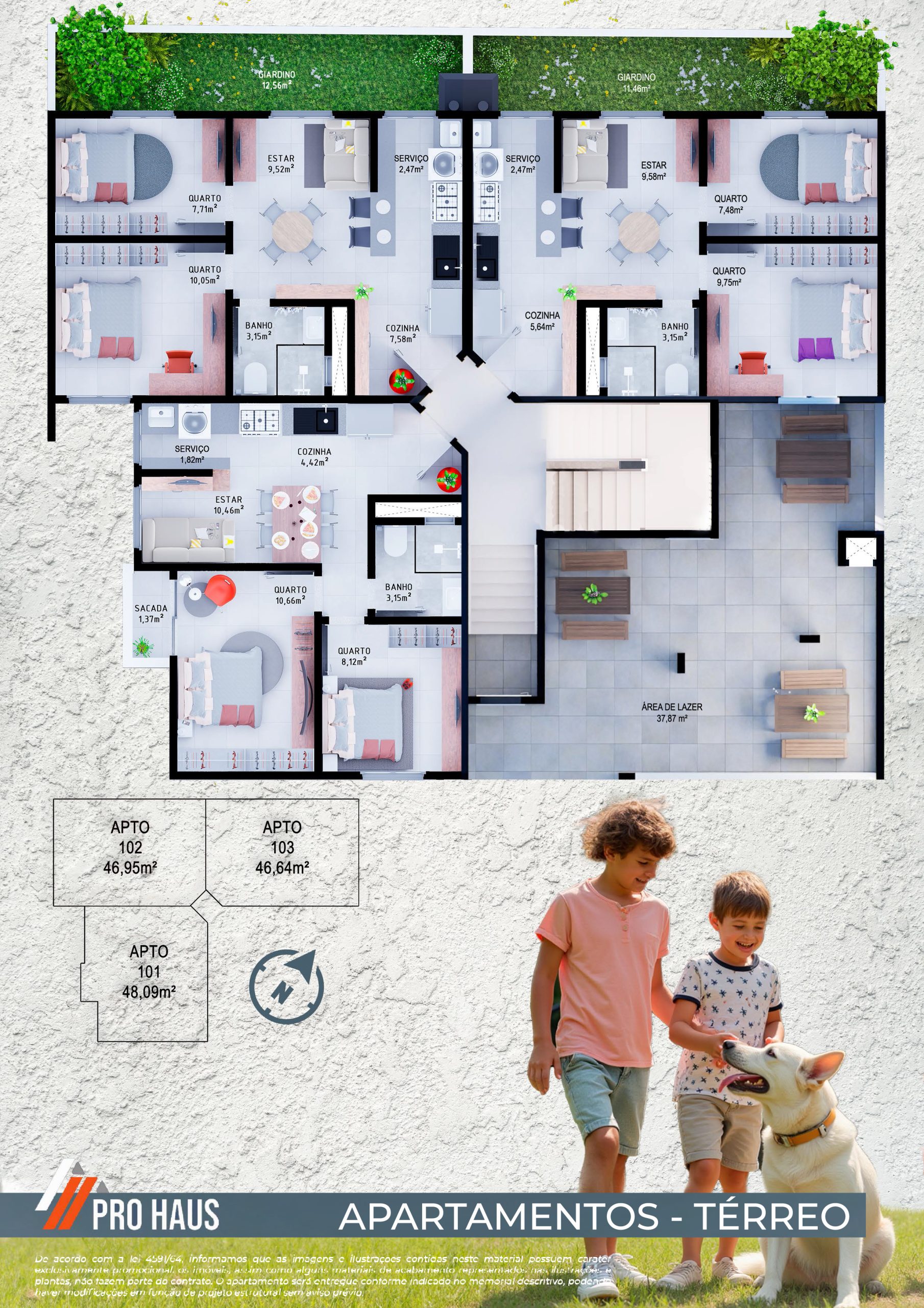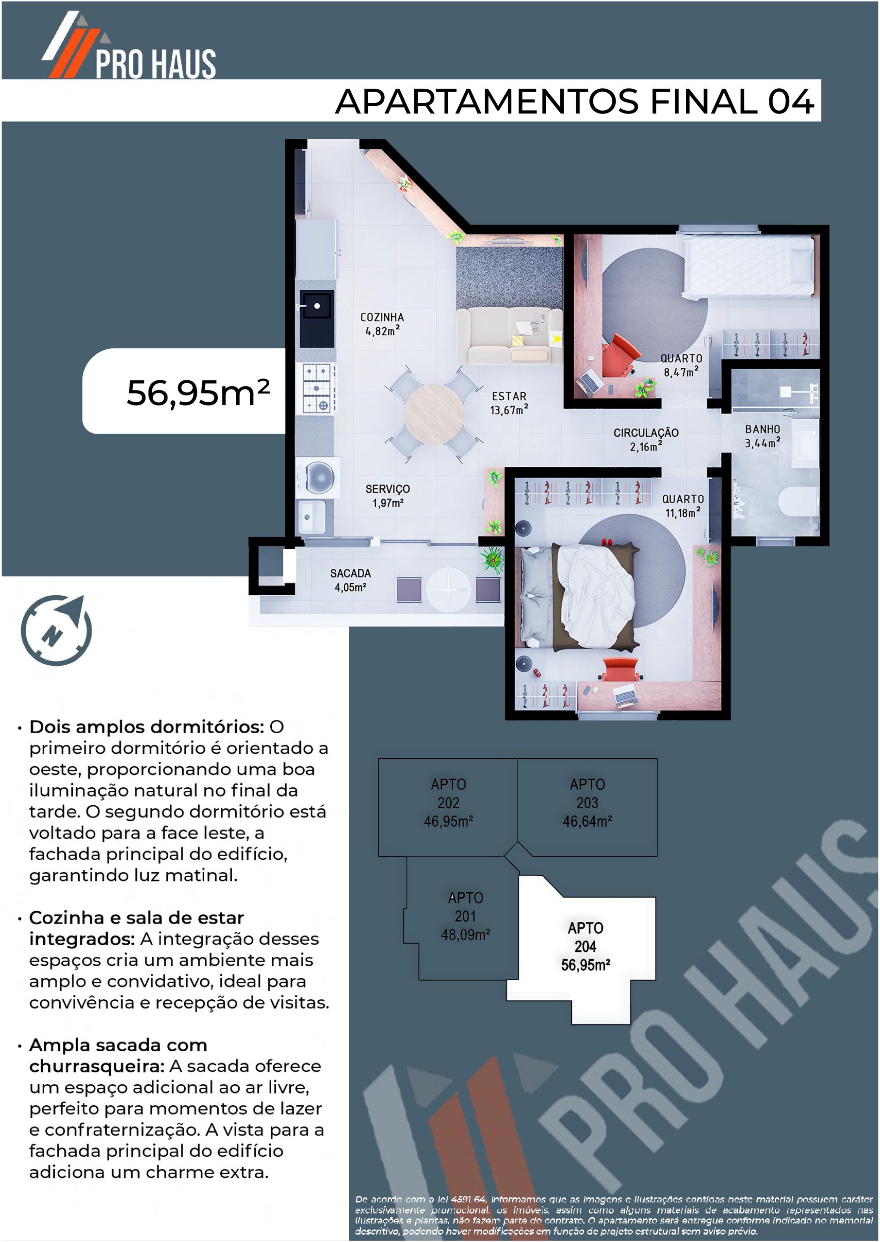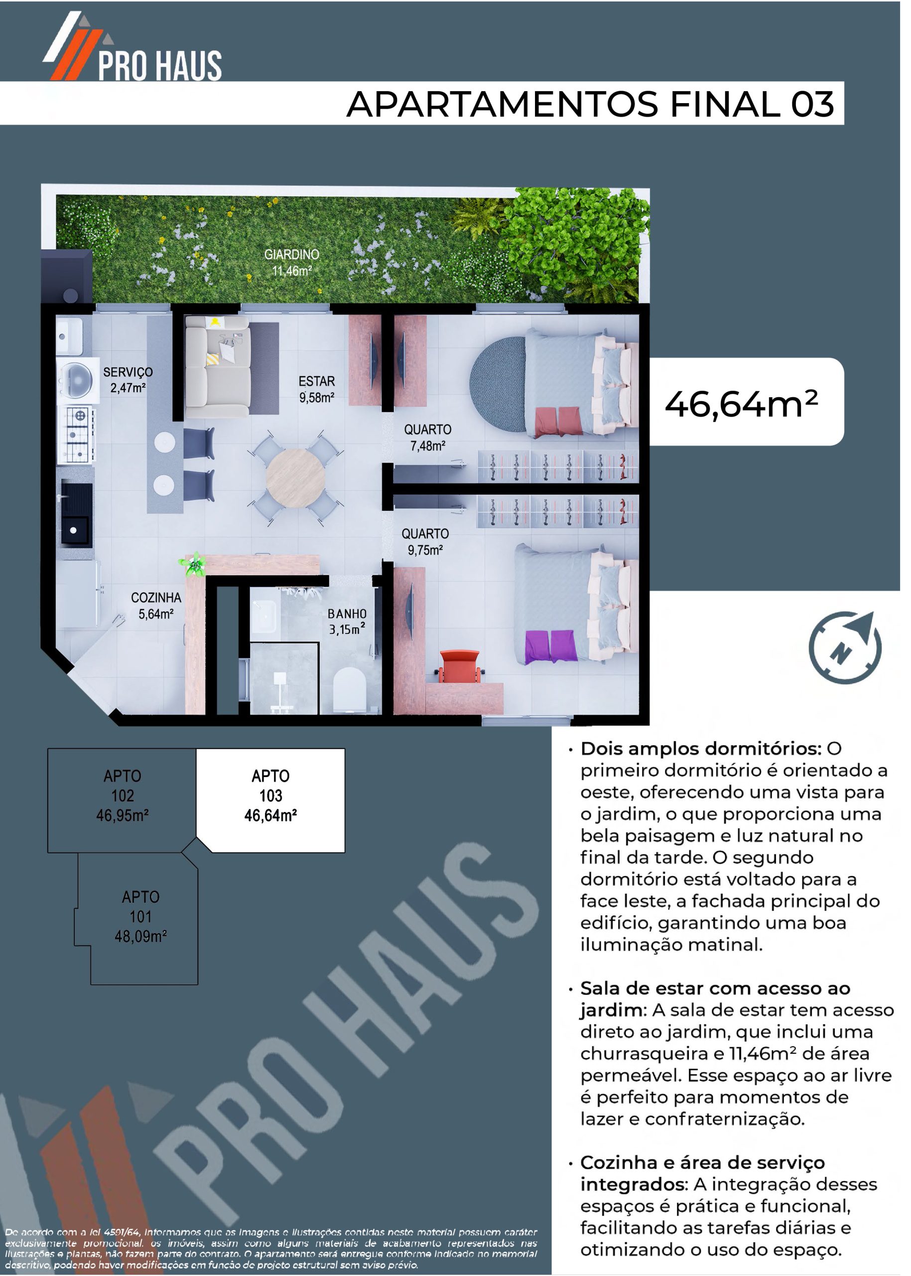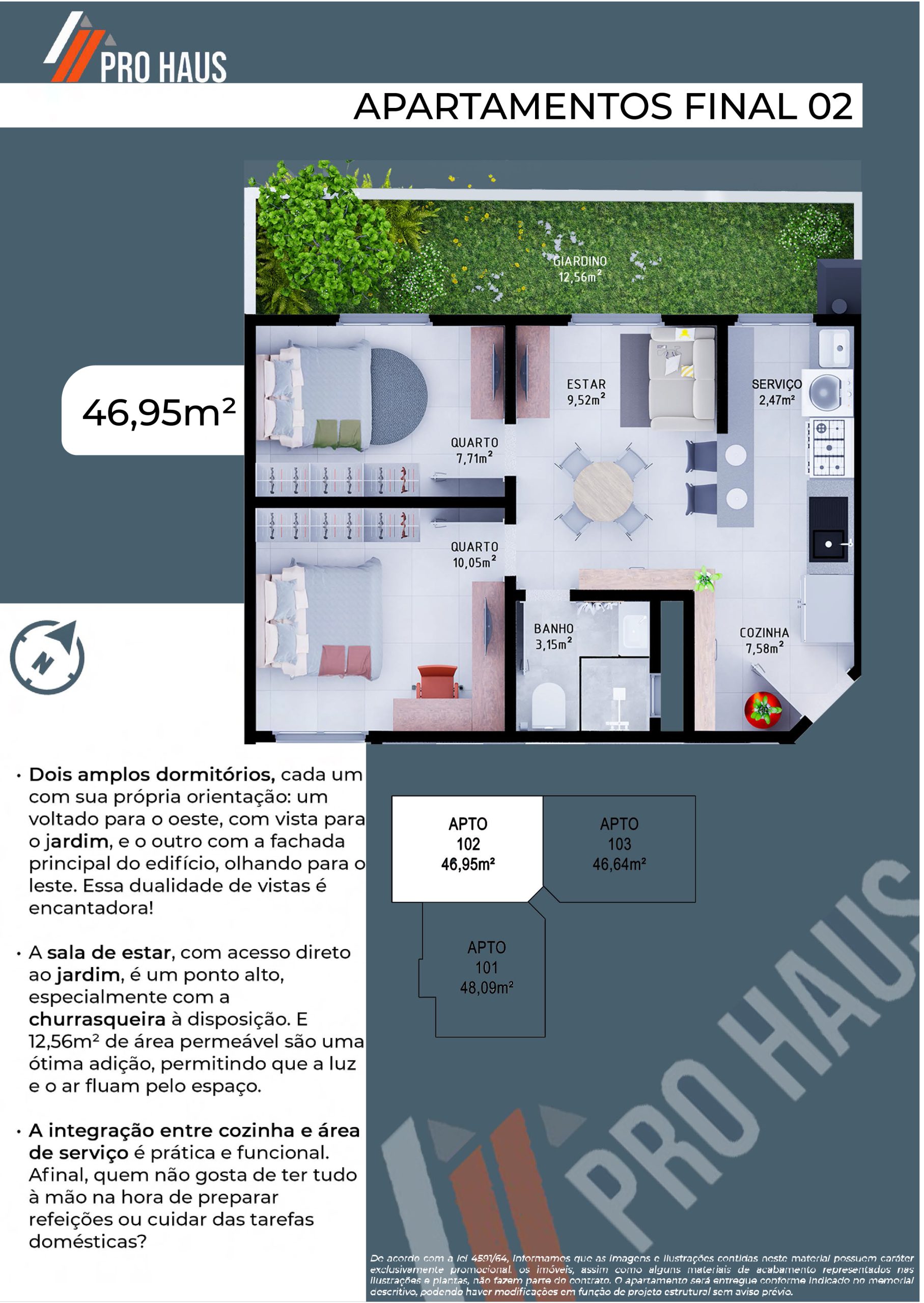 Com apartamentos de 46 a 56 m² com 2 dormitórios, você pode aproveitar a tranquilidade de morar em um condomínio com apenas 7 unidades que te oferece muita funcionalidade: